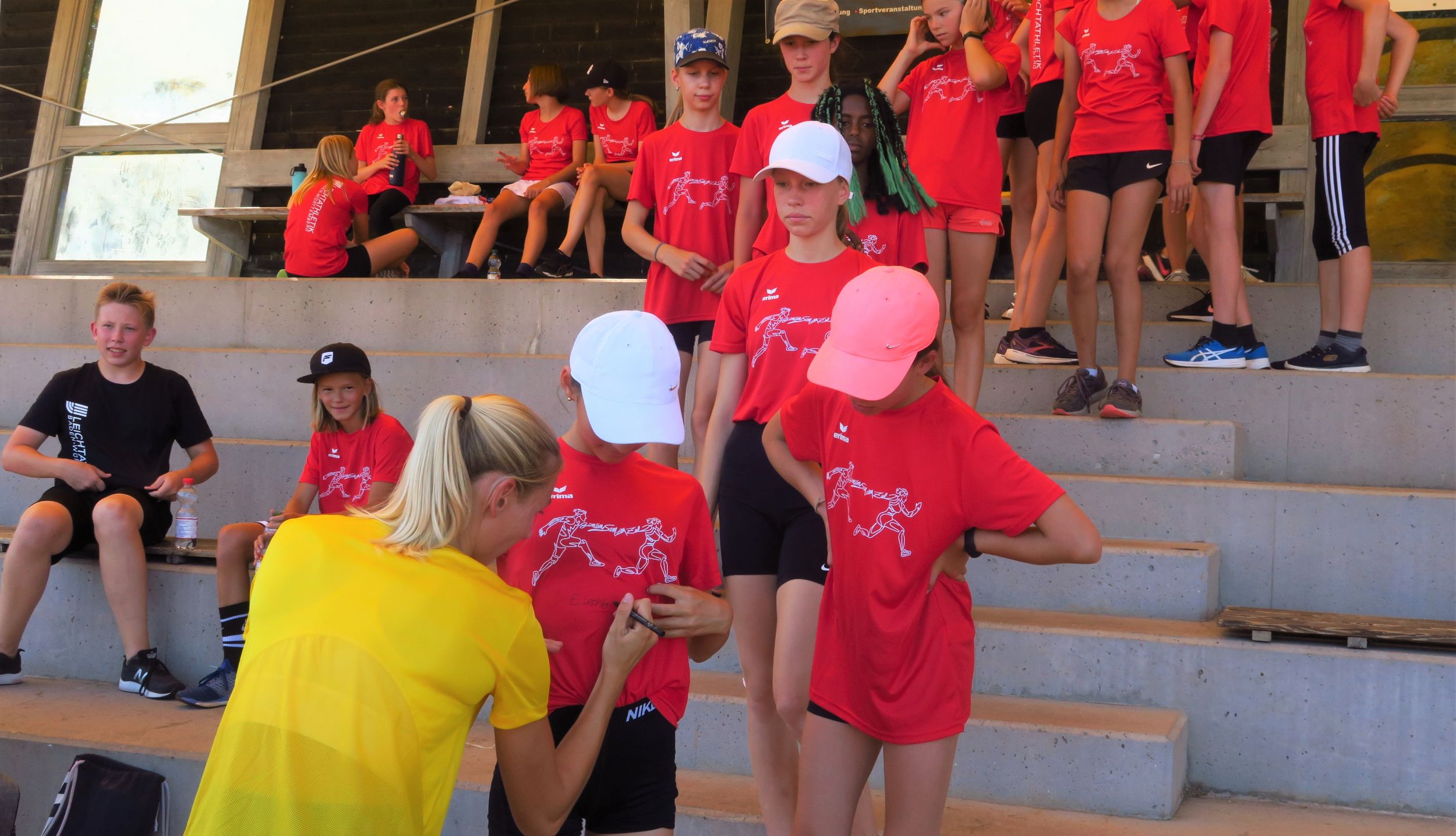 Nach der Begrüßung durch die Camp-Leiter Volker Zahn bzw. Christian Hummel konnte es im Stationenbetrieb losgehen, der in fünf Leichtathletik-Einheiten fast den ganzen Disziplin-Kanon abdeckte. Kennenlernspiele sorgten dafür, dass die Gruppen mehr Wissen über ihre Mitglieder anhäuften. Eine besondere Überraschung gab es für die Albstädter Gruppe: WM-Teilnehmerin Elisa Lechleitner – im Vorjahr noch als Betreuerin dabei – stattete dem Camp einen Besuch ab, gab Einblicke ins WM-Unternehmen und im Stadion dann auch massig Autogramme.