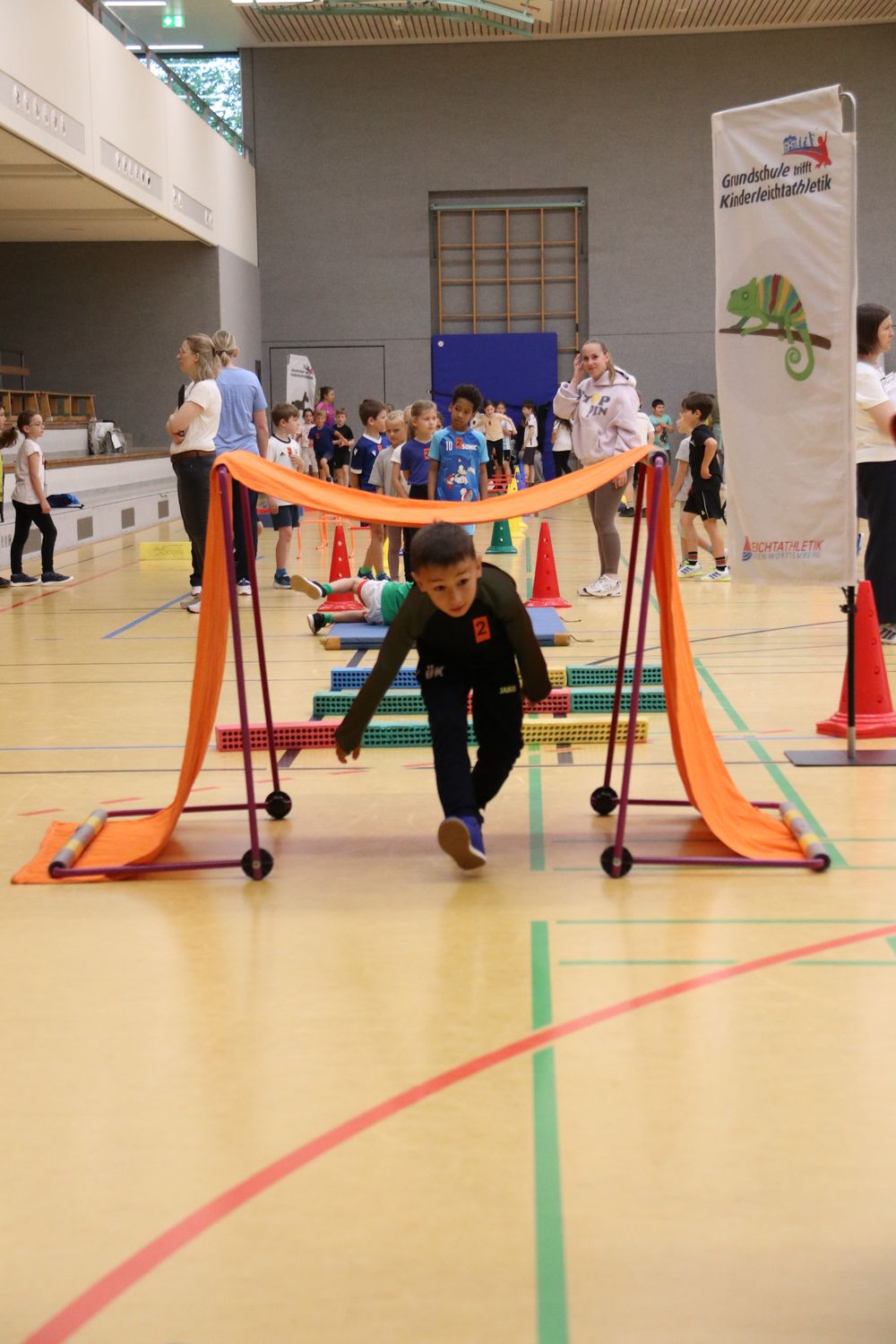 Am 06.06. ging es dann für das Projektteam des WLV auch schon an die nächste Schule. Dieses Mal in Heimsheim. Trotz des regnerischen Wetters waren alle Kinder eifrig dabei und wollten unbedingt alle acht Stationen einmal ausprobieren. Dank der Spontanität aller Helfer:innen konnte die Veranstaltung teilweise in der Halle und teilweise draußen auf dem Tartanplatz durchgeführt werden und der Wunsch der Kinder, alle Stationen durchführen zu dürfen, wurde erfüllt. Auch hier durfte die Vorführung des Topathleten nicht fehlen. Alle Kinder freuten sich auf Lias Schuster des LV Biet und beobachteten genau wie er von Sprung zu Sprung weiter flog.