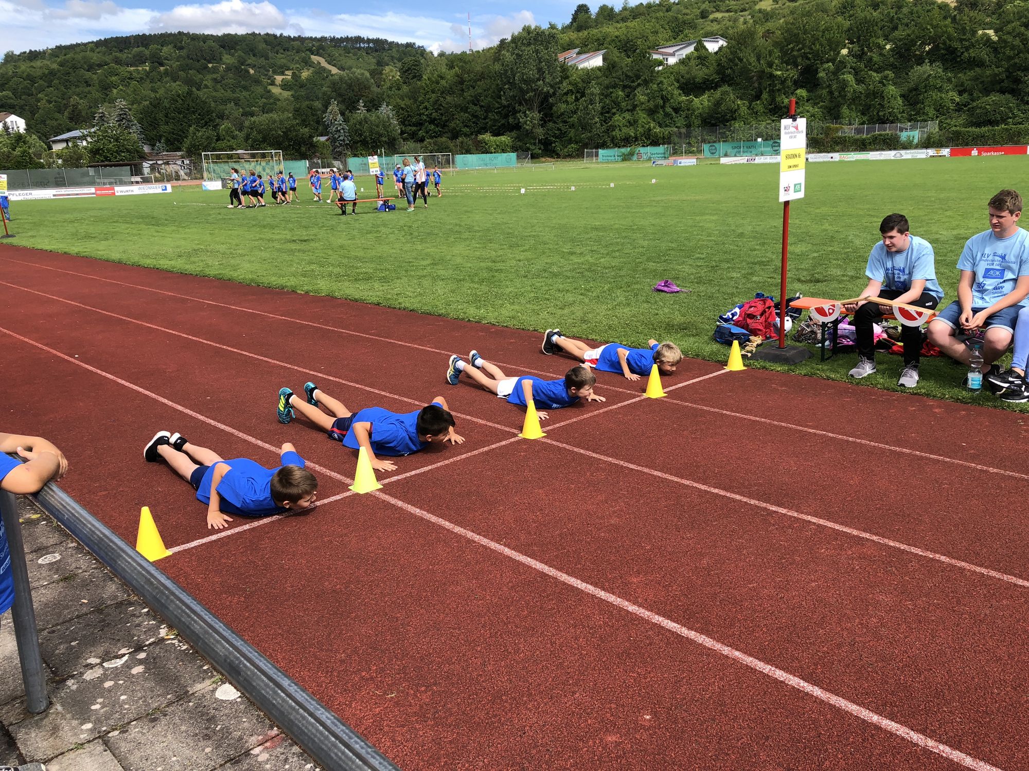 Die motivierten Helfer rund um Trainerin Christine Geldbach begrüßten bei strahlendem Sonnenschein das WLV-Team. Die 8 Stationen waren schnell aufgebaut, sodass alles bereitstand, als die Kinder eintrafen. Ausgestattet mit blauen T-Shirts gesponsert von der AOK und weiteren Projekt-Partnern konnte der spannende Sporttag beginnen. WLV-Praktikantin Maike Anstett bekam zum ersten Mal für die gesamte Veranstaltung das Mikrofon in die Hand und konnte damit innerhalb ihres Praktikums erste Moderations-Erfahrung sammeln.